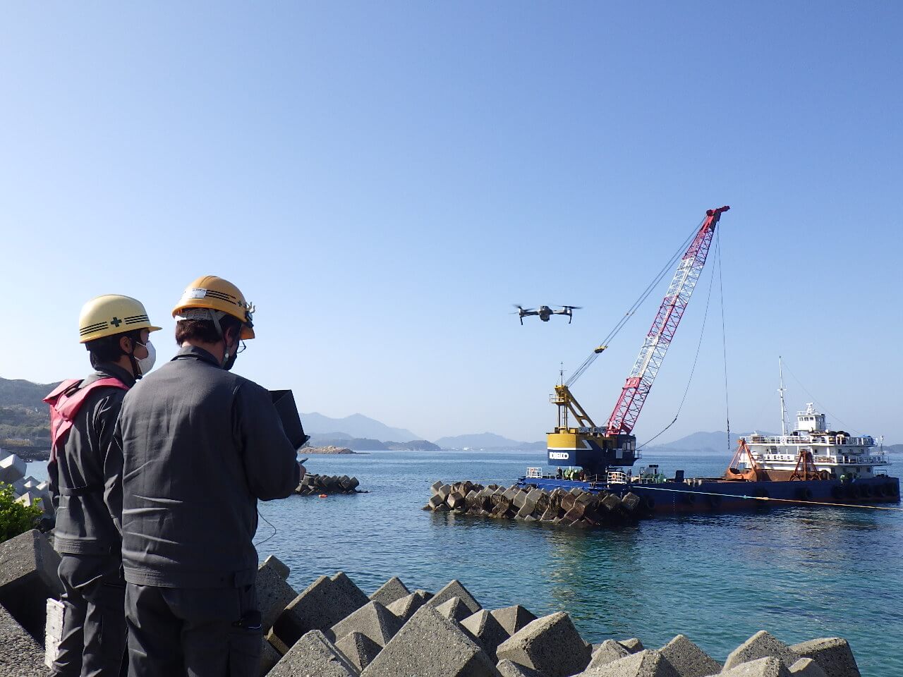 海上工事から陸上工事まで様々な現場施工に対応しています。近年ではドローンシステムなどのICTも活用し、安全性と技術の向上を繰り返しながら、地域の人々の暮らしをしっかり支えられるよう、各種工事に取り組んでいます。