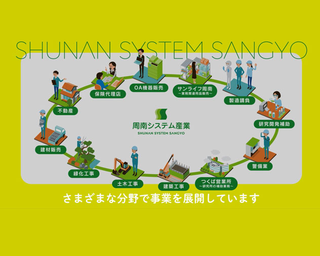 - 建築・土木・造園工事の設計施工、宅地建物取引、不動産の賃貸管理、建設資材販売、損害保険代理店・生命保険代理店、産業廃棄物収集運搬、OA機器販売、工場構内業務請負、サンライフ周南(小売業)