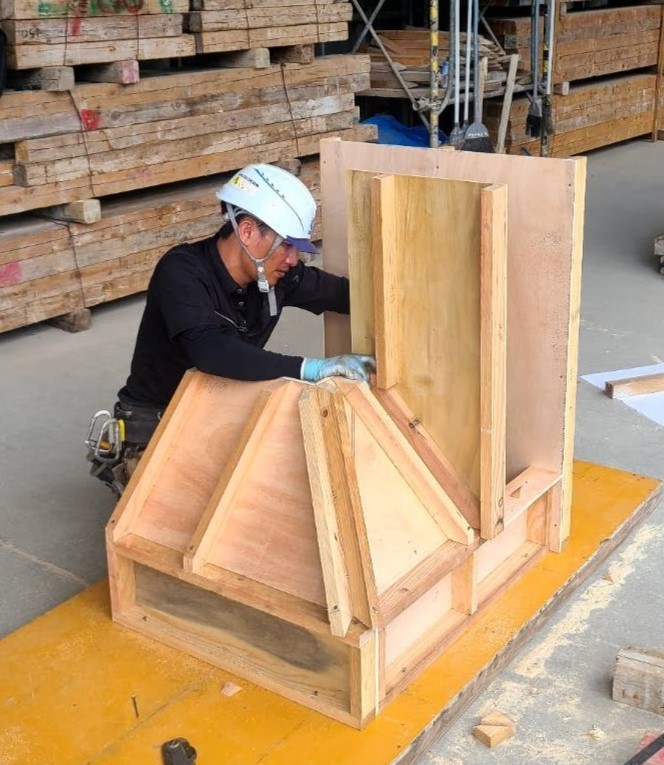 - 鉄筋コンクリート造の建物などをつくる際の コンクリートを流し込む型枠をつくる仕事です。コンクリートは、液体なので、形を決める為の枠が必要であり、壁・柱に求められる条件や形状はもちろん、 現場の作業環境、作業日程などを考慮して、 最適な工法を見極めて施工を行います。
