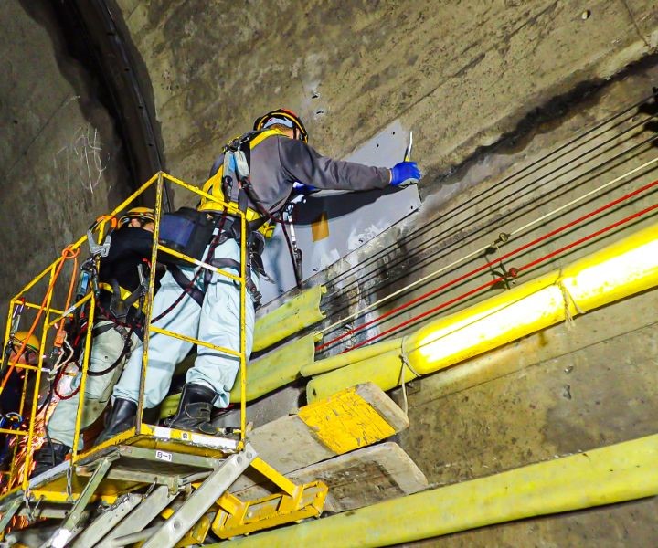 - 新幹線トンネルの側壁から天井アーチ部の経年劣化したコンクリート修繕や、排水溝グレーチング等の取替修繕を行います。