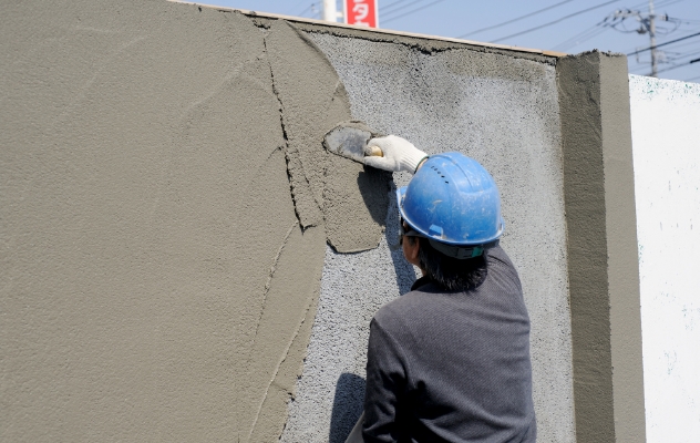 工作物に壁土、モルタル、漆くい、プラスター、繊維等をこて塗り、吹付け、又ははり付ける工事