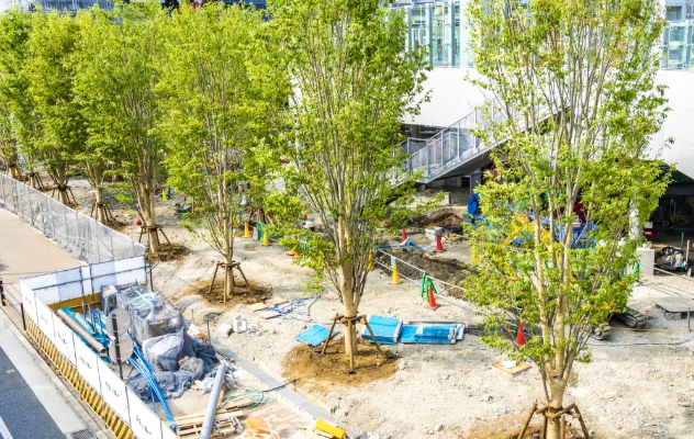 整地、樹木の植栽、景石のすえ付け等により庭園、公園、緑地等の苑えん地を築造し、道路、建築物の屋上等を緑化し、又は植生を復元する工事